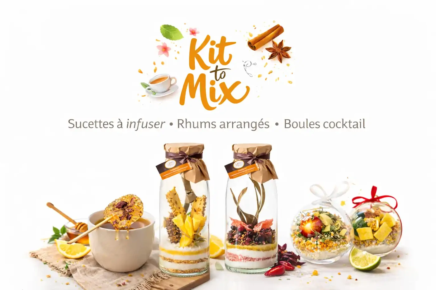 Kit To Mix est une marque artisanale française en Charente Maritime qui propose des kits à mélanger uniques et hauts de gamme, des recettes entièrement personnalisées, avec des ingrédients naturels, des kits simples, rapides à réaliser et délicieux, des kits cocktail maison aux saveurs exotiques, des sucettes à infuser pour réaliser des infusions, des boissons chaudes originales ou à transformer en grog : des produits parfaits pour un goûter, un apéro maison et pour tous vos événements.